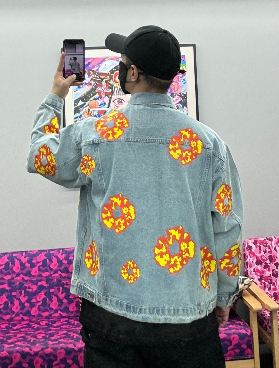 A stunning display of craftsmanship. Don't sleep on this inspired by - DENIM TEARS Washed Flame Denim Jacket, Kapok Flower Denim Jacket, Imported Denim Fabric - 80 Levi's Sole, Multiple Irregular Prints, Custom Leather Patches and Buttons. Unisex, Sizes: M-3XL.